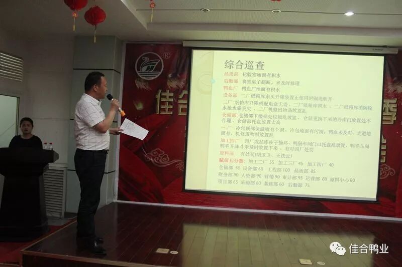 18:20分,會議在歡快的音樂聲中正式開始。本次會議的主持人是總經辦李冰和姚亞萍。本次會議共分為四個部分。第一部分是八個巡查小組公布檢查結果及問題點,第二部分是為獲獎部門頒獎,第三部分是最後一名做進步承諾,第四部分是為晨會PK獲獎部門頒獎。為了使大家更加清楚明了本部門問題所在,總經辦将問題彙總,以ppt的形式展現給大家。經過一個月的檢查,最終,評比出月度表現突出的部門,職能部門維度第一名是财務部,第二名是人資部,第三名是營銷部,生産維度是加工二廠(第一名),生産輔助維度是工程部(第一名)。公司對獲得前三名的部門分别給予1000元,600元,400元的獎勵,并讓最後一名做出進步承諾。