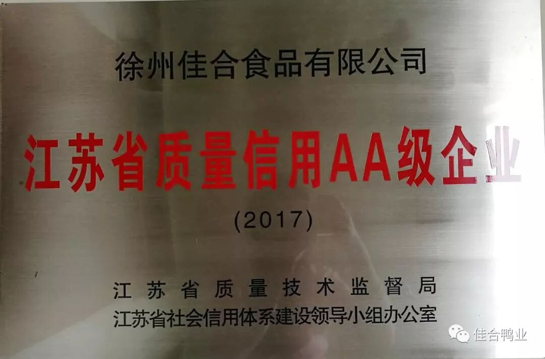 日前,省質監局與省社會信用體系建設領導小組辦公室聯合公布了江蘇省2017年質量信用AA級企業名單,徐州佳合食品有限公司榮獲“質量信用AA級”稱号!這是我公司不斷追求卓越,強化質量管理,深化質量提升、誠信經營的結果。我公司不斷努力創新,2017年先後獲徐州市“創牌立信”示範單位、市質量獎後再獲殊榮。為我縣質量誠信建設樹立了新标杆。